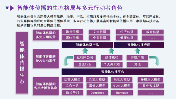 2025年被称为“智能体元年”,智能体(AI Agent)作为基于大模型的重要技术应用形态愈发活跃,正以一种“新兴媒介”的态势融入社会传播。当前,我国主流媒体、主要互联网平台、垂直行业融媒体以及其他新兴媒体,积极融入智能体传播发展新趋势,开展智能体应用实践创新。当智能体与社会信息传播充分融合,它不仅是媒体内容生产的新工具,更成为连接用户、信息与服务的新枢纽。在此背景下,我校媒体融合与传播国家重点实验室新媒体研究院与新浪AI媒体研究院联合发布《智能体与传播应用研究报告》。本报告在融合传播和应用创新的视角下,以智能体(AI Agent)与传播的融合为主轴,以智能体传播的形式、载体、现象、产品、案例为观察对象,通过分析智能体与传播的融合表现、融合机制、融合生态与融合影响,探讨Agentic AI不断深度融入媒体与传播的未来图景。